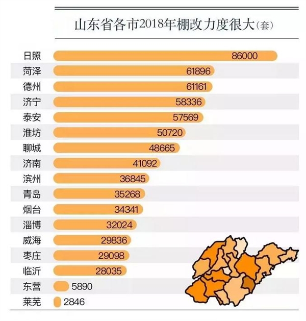 2018年山东省计划棚户区计改造69.9万套,改造力度目前位居全国第一。近期,山东公布了2018年各市的计划棚改量: