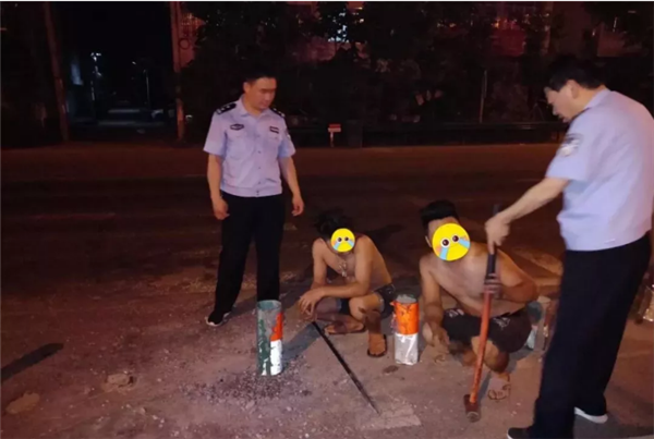 让民警没想到的是,就在民警驱车准备将损毁交通设施的钱某某移交给交警大队时,两公里外的另一个段公路中间,两名男子挥舞着锤子、钢棍等工具,正在砸路中间的隔离栏杆。